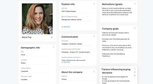 Așa am „inventat-o” pe Maria Pop, clienta noastră din Brașov, care dorește să îți crească afacerea ei de suflet, o cafenea. În timp ce am realizat profilul, ne puneam întrebările din perspectiva Mariei, nu a unui avatar virtual, ireal.