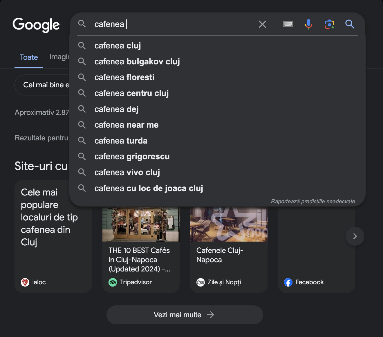 Tip: Folosește autocomplete-ul de la Google. Te poate ajuta să găsești cuvinte-cheie long tail valoroase pentru SEO Local.