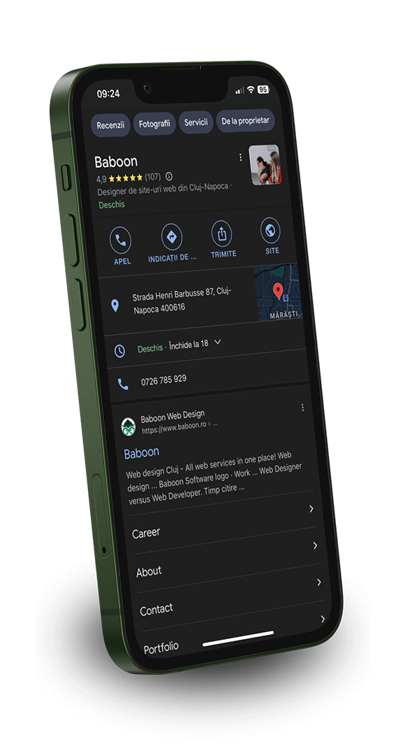 Dacă afacerea ta nu este optimizată pentru căutarea locală, poți rata clienți care sunt pregătiți să cumpere sau să acceseze de un serviciu din zona ta. Iată unde ai vrea să te afli la orice căutare de tip „x NEAR ME” sau „y CLUJ”.