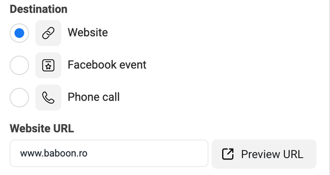 Mai apoi, vei selecta destinația spre care să fie direcționat publicul țintă, opțiunile fiind: Website, Eveniment Facebook sau Apeluri telefonice.