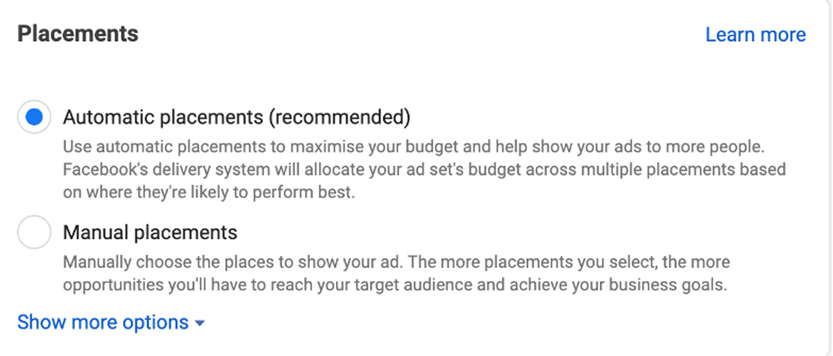 Poți select opțiunea de Automatic Placements/Poziționări Automate, prin care sistemul de livrare al Facebook va distribui automat în toate locațiile existente precum: Facebook, Instagram, Messenger, Audience Network – incluzând automat fluxurile/feeds și Stories/Reels pentru fiecare dintre acestea.