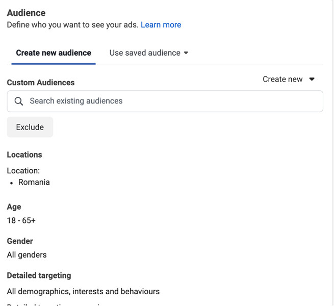 Mai departe, vei merge la partea de Audiențe, de unde selectezi care să îți fie publicul țintă pentru reclama ta.