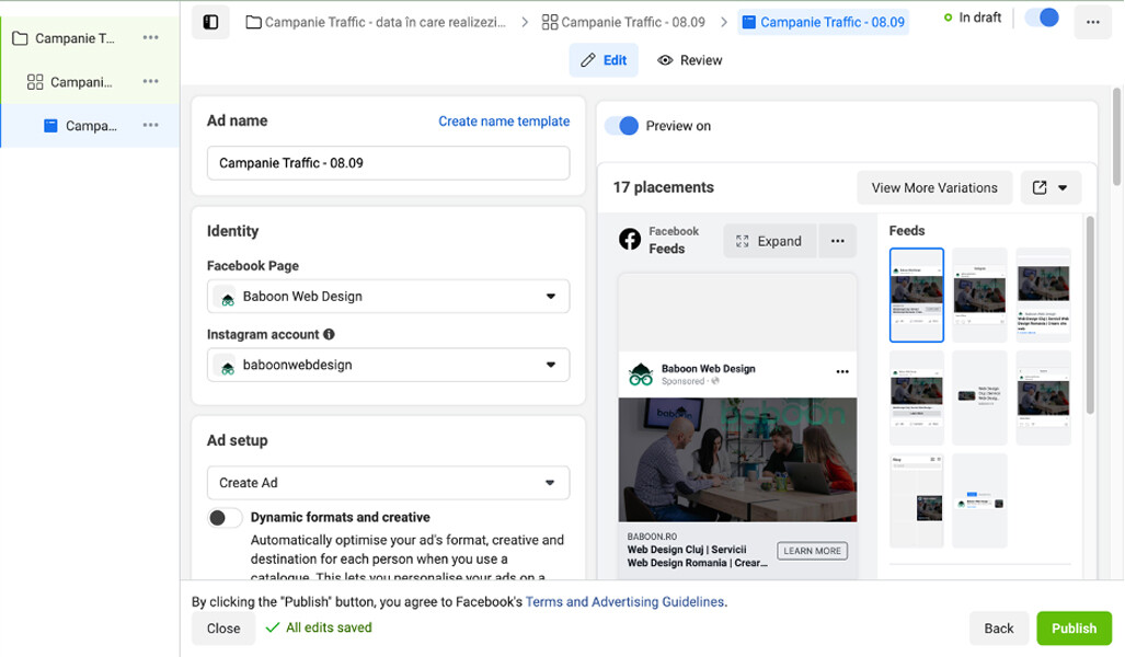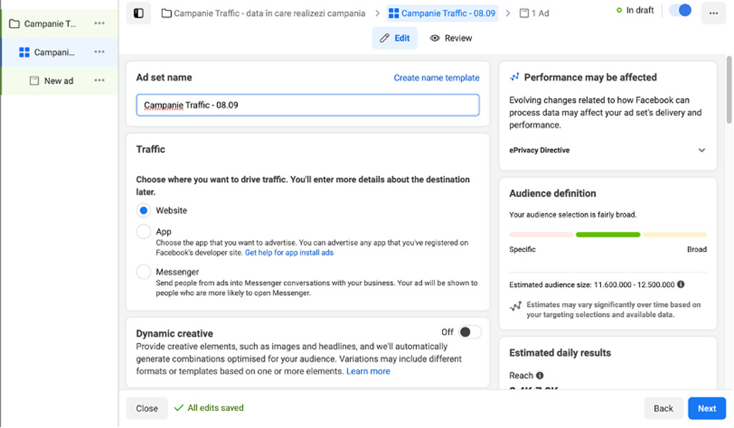 Acum că am învățat partea teoretică, propun să punem în aplicare ceea ce am parcurs până acum și să facem o campanie împreună. Vom face o campanie de Trafic, lucru pe care vi-l recomandăm și noi dacă businessul tău este la început și are nevoie de puțină notorietate și încredere în brand.