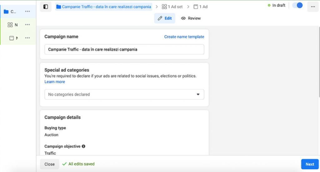 Îți recomandăm să notez titlul și data în care creezi campania pentru a-ți fi mai ușor de urmărit. În această fereastră avem o scurtă revizuire a campaniei, în cazul în care reclamele tale nu se încadrează în categoria de reclame speciale, vom apăsa butonul Next/Următorul fără a face vreo setare/modificare.