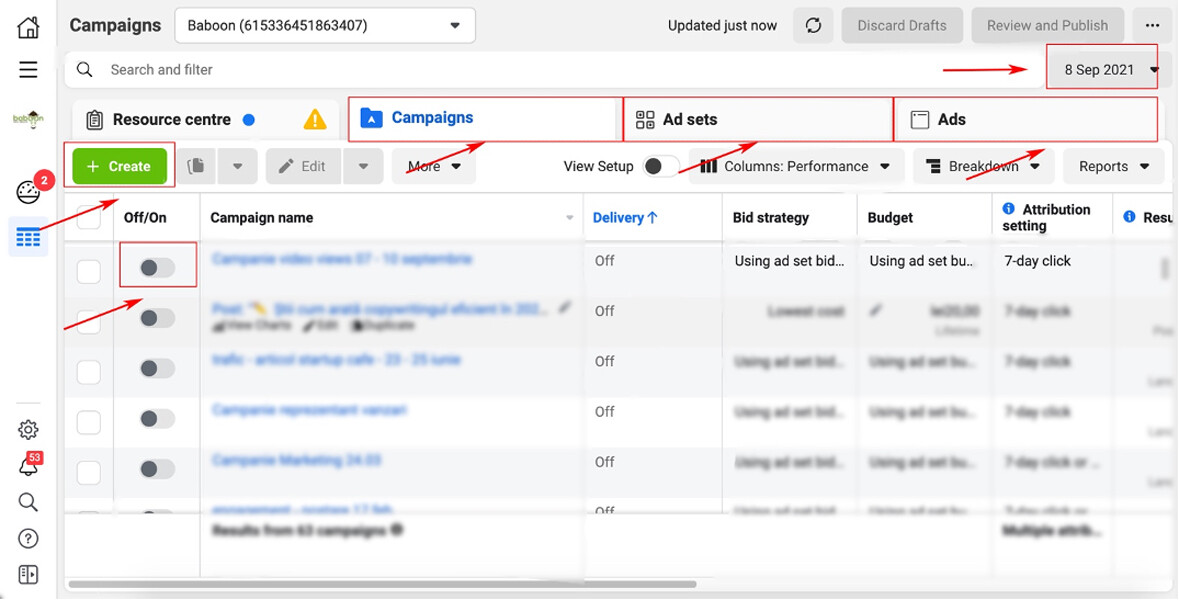 ON/OFF – butonul prin care poți opri sau reporni o campanie care a rulat deja