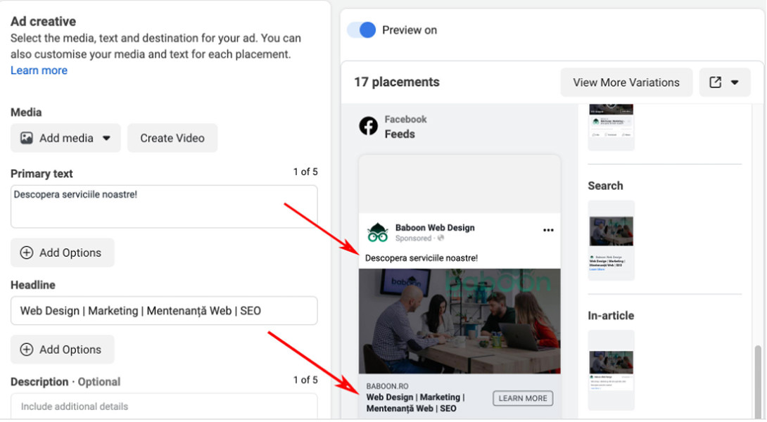 După ce ai selectat formatul dorit, vei trece la Componenta creativă a reclamei, de unde vei putea încărca imaginile și nota textul dorit precum mai jos.