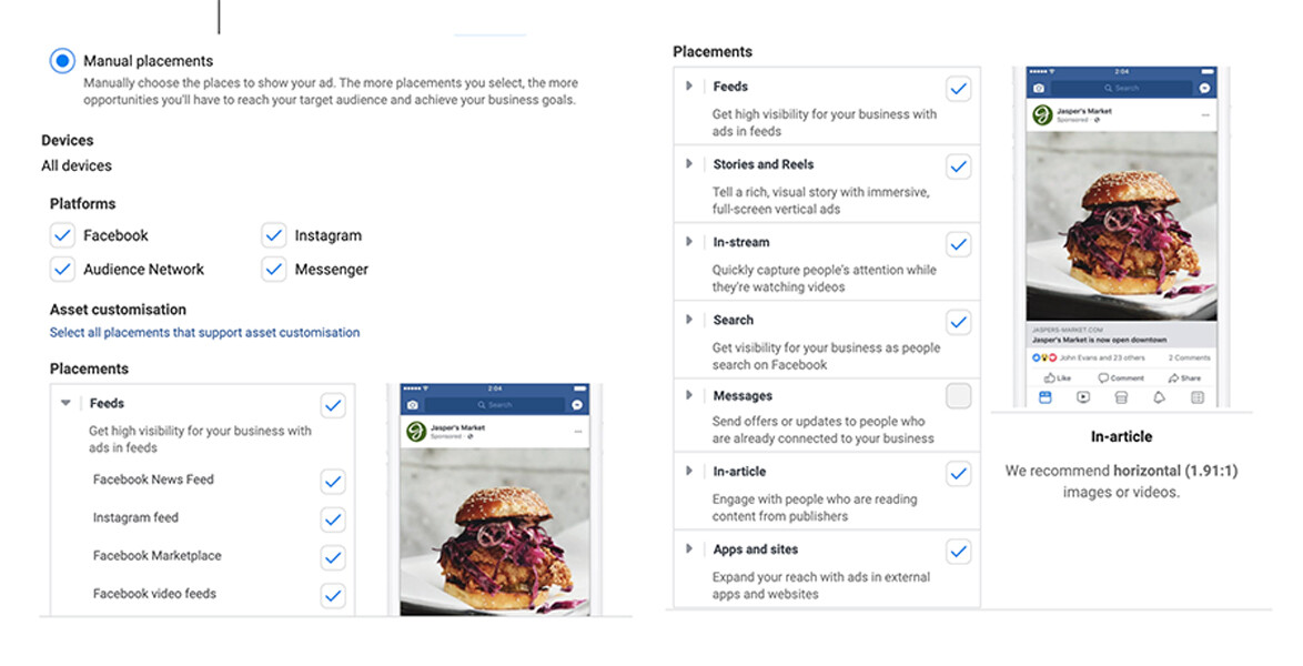 Dacă optezi pentru pozițonări manuale, vei selecta tu unde mai exact să se afișeze reclama ta. De exemplu dacă îți dorești ca reclama ta să se afișeze doar pe Instagram (feed și stories/reels) vei bifa doar Instagram și reclama ta se va rula doar în cadrul respectivei rețele.