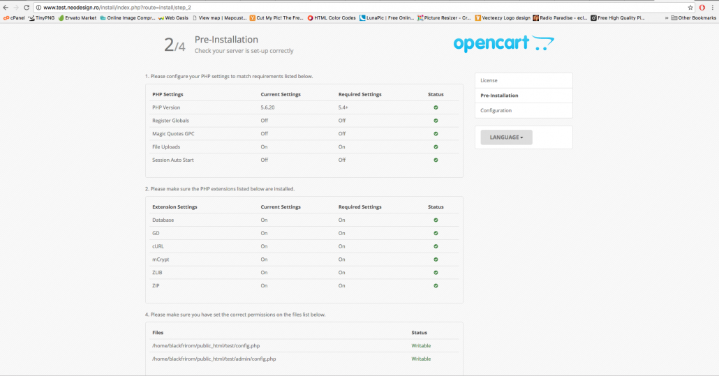2. La urmatorul pas vor aparea rezultatele unui test care verifica daca ai toate fisierele necesare pentru continuarea instalarii OpenCart-ului.