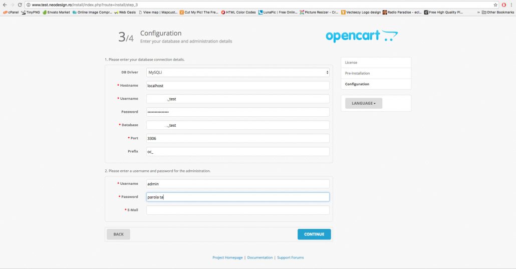 Pasul trei: Crearea unei baze de date si unui user prin intermediul caruia sa accesezi acea baza de date. Si acest proces este foarte usor de realizat, accesezi cPanel-ul si navighezi la BazeDeDateMySQL, mai departe iti vei da seama usor ce este de facut. Creezi baza de date si atribui userul creat la aceasta, si OpenCart-ul este gata de instalare.