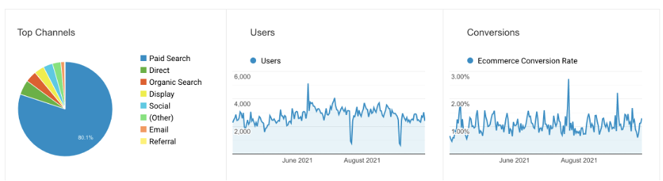 Datele sunt folositoare dacă ai campanii Google Ads, Facebook Ads sau dacă folosești strategii de remarketing. Aici observi performanțele campaniilor și le compari cu traficul organic.