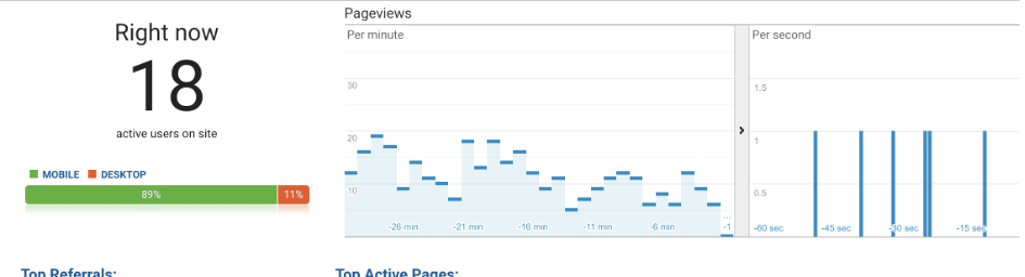 1. Din contul tău de Analytics, dacă dai click pe Real Time, apoi pe Overview vei avea acces la date complexe, de ultimă oră despre situația site-ului tău. Acestea vizează: