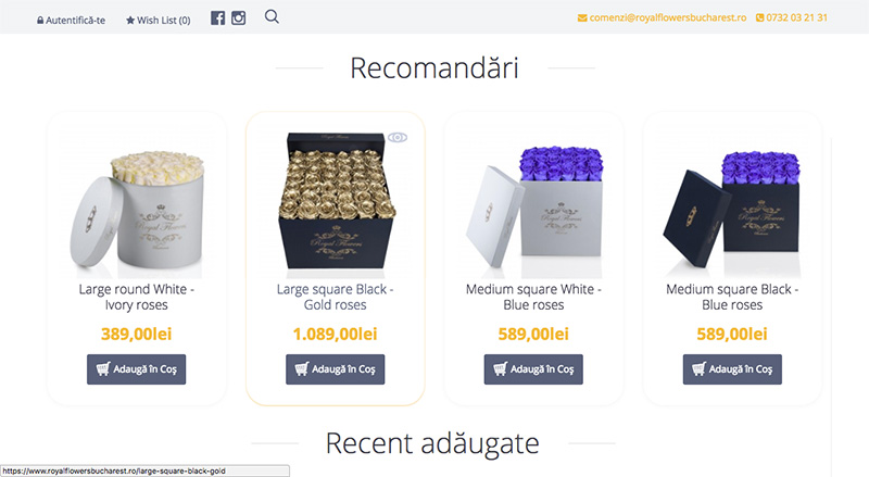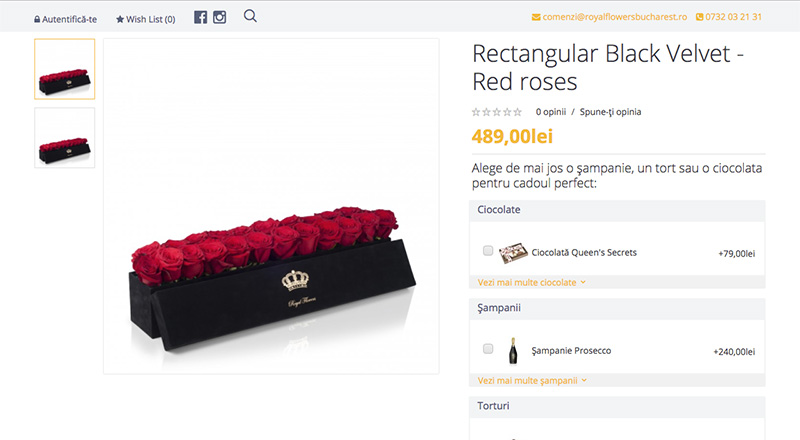 Pe principiul tipului de vânzare “kechup doriți?”, pe pagina produsului am pus produse suplimentare care se pot comanda împreună cu florile: ciocolată, șampanie, etc. Aceste produse se pot adăuga foarte simplu în coș, prin bifarea lor în pagina de produs.